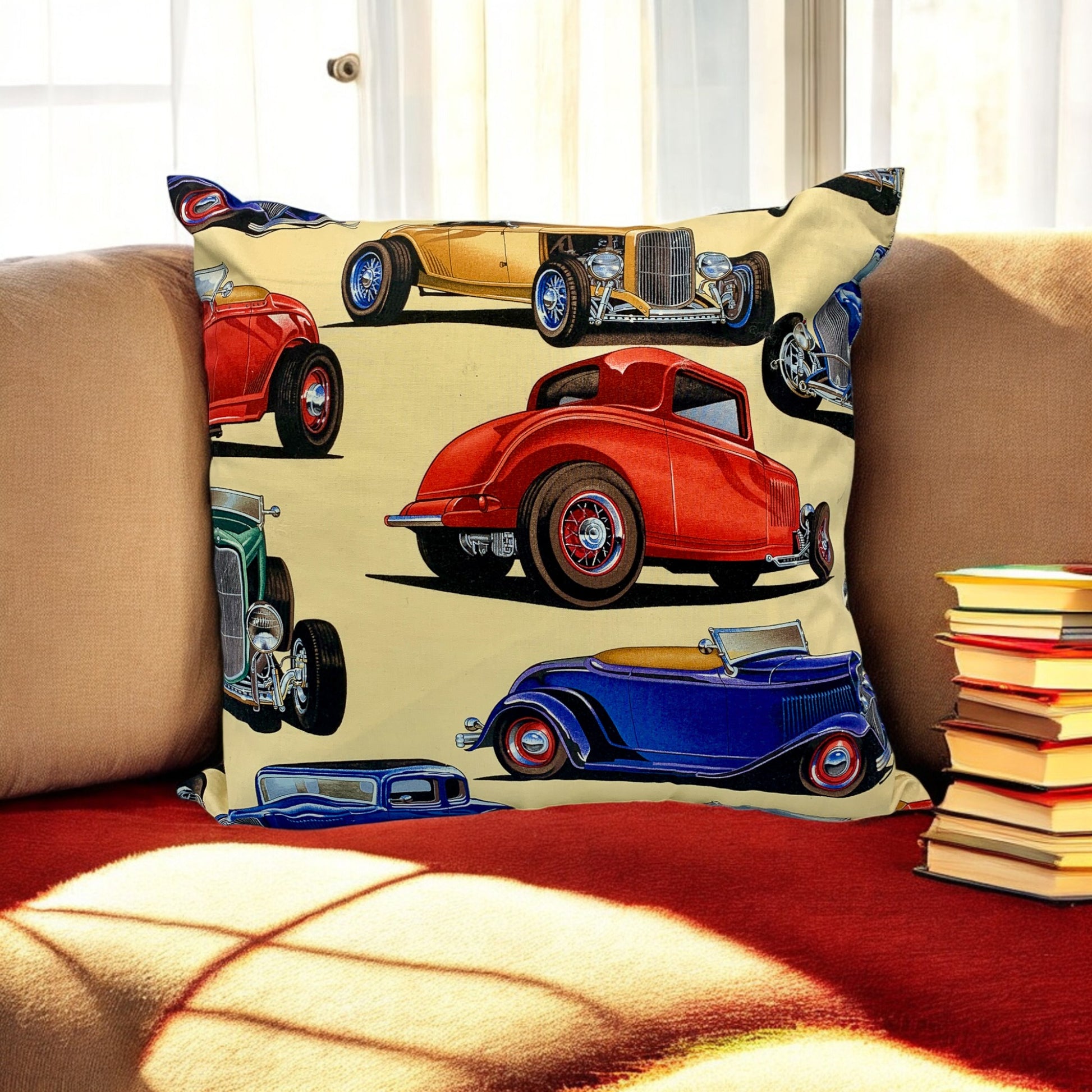 Rev up your home decor with the Classic Hot Rod Throw Pillow. Featuring a bold and vibrant design of vintage hot rods in striking colors, this pillow is perfect for car enthusiasts and lovers of retro style. Whether in your living room, office, or man cave, this pillow adds a dynamic and unique touch to any space.